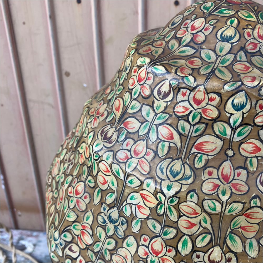 プリミティブな花柄が印象的なキャメル革製テーブルライトです。
