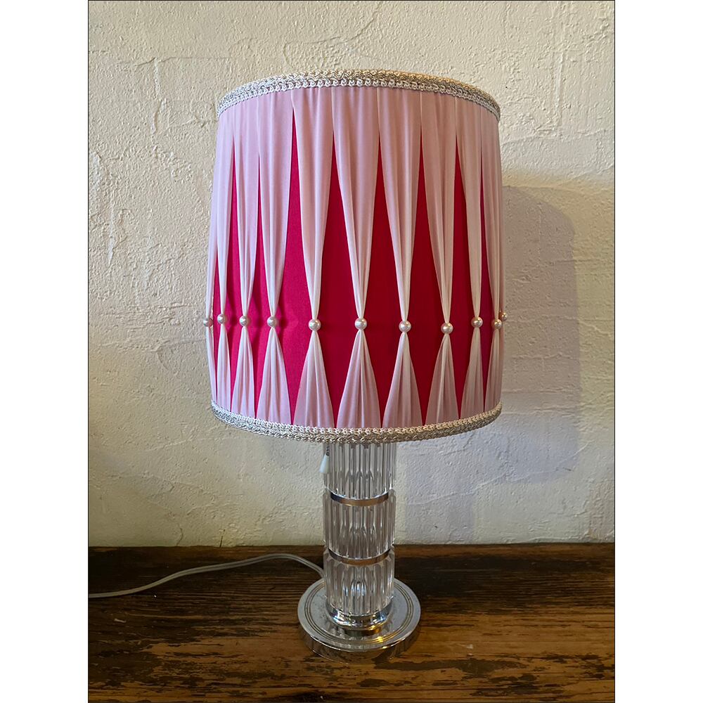 プリーツシェードやガラス支柱のクラシカルデザインが印象的なテーブルライトです。